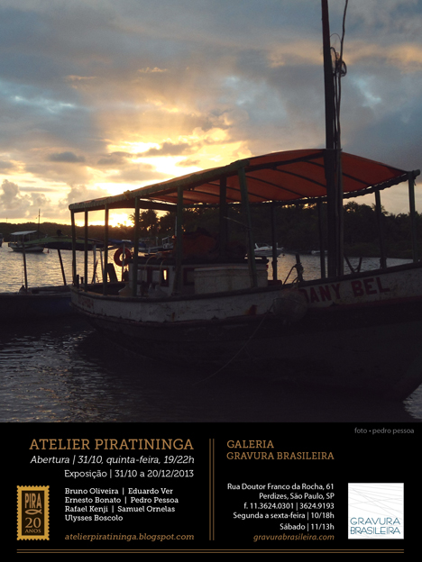 A exposição apresenta gravuras, desenhos e pinturas dos artistas Bruno Oliveira, Eduardo Ver, Ernesto Bonato, Pedro Pessoa, Rafael Kenji, Samuel Ornelas e Ulysses Boscolo, integrantes do Atelier Piratininga. A mostra marca os 20 anos de existência do ateliê coletivo que se firmou neste período como um importante aglutinador de artistas interessados em compartilhar suas pesquisas sobretudo no campo da gravura. O Atelier, gerido de forma independente, vem se renovando desde a sua criação, em 1993, e congrega atualmente uma vintena de artistas, entre membros, residentes e alunos dos cursos de desenho e gravura. O grupo organiza regularmente em seu espaço, exposições, projetos de intercâmbio artístico e residência, além de atividades educativas. A exposição na Galeria Gravura Brasileira apresenta um recorte na variada produção dos seus artistas atuais, tendo a gravura como ponto comum de interesse.